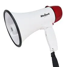 Megafón REBEL DH08 Výkon 5W, priemer 130mm, dĺžka 220 mm. napájanie 4 x R14. Možnosť použiť megafón ako sirénu. Výkonný prenosný megafón vhodný pre všetky vonkajšie akcie. S výkonom 5W a mikrofónom s vysokým rozlíšením dokáže reprodukovať čistý zvuk až na vzdialenosť 150 m. Má vypínač, mikrofón, sirénu a posúvač hlasitosti. Je vyrobený z odolného ABS plastu a má sklopné rameno a remienok na zápästie pre ľahké prenášanie. Napájanie 4x R14 batériami (nie sú súčasťou balenia).